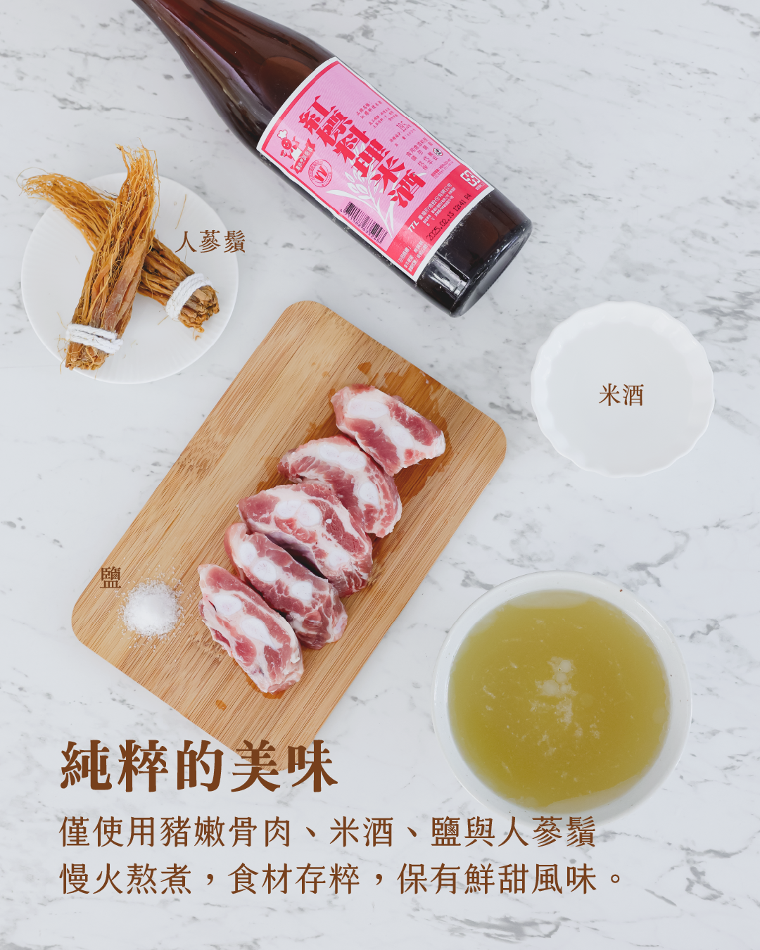 使用人蔘、米酒、鹽經過細膩處理,與長時間燉煮,讓您在家中即可輕鬆品味到台南小吃的獨特魅力。