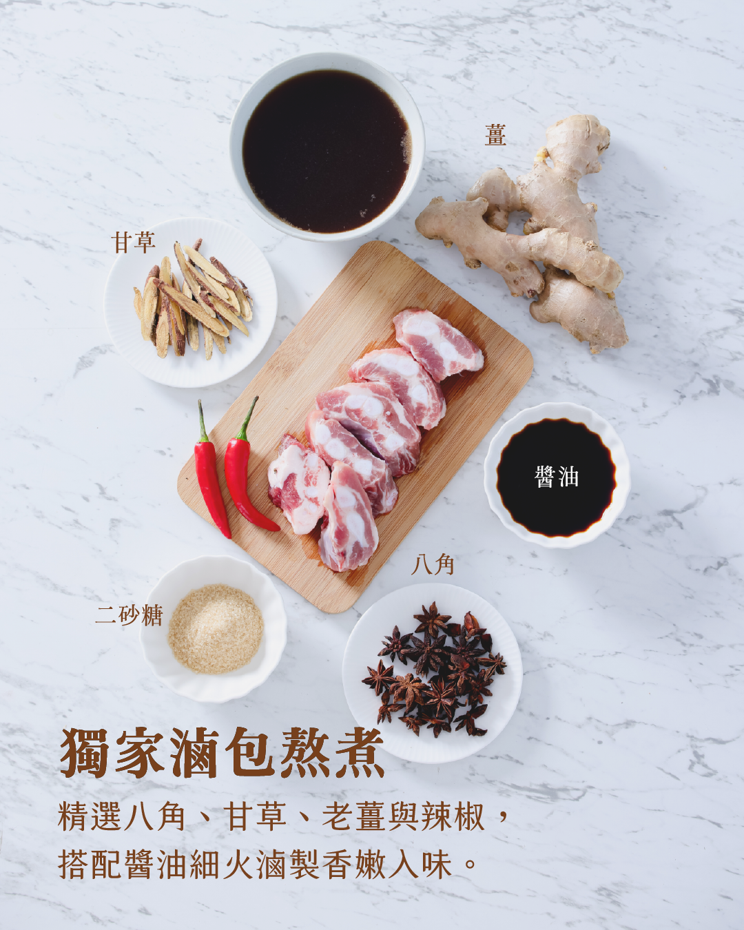 匠心比例熬煮醬汁,融合八角、醬油與天然辛香,慢火滷製入味,醬香濃郁而不膩。